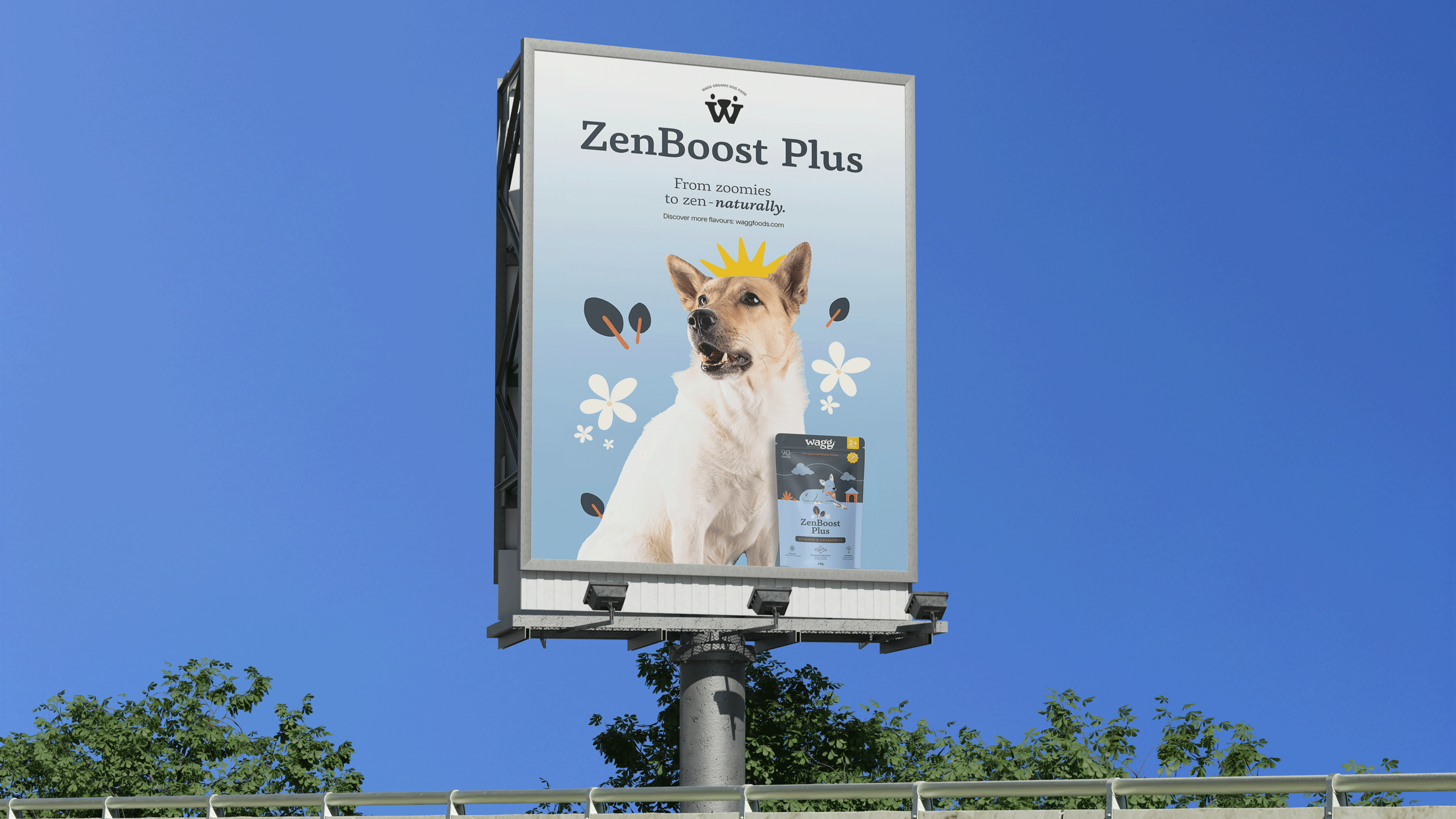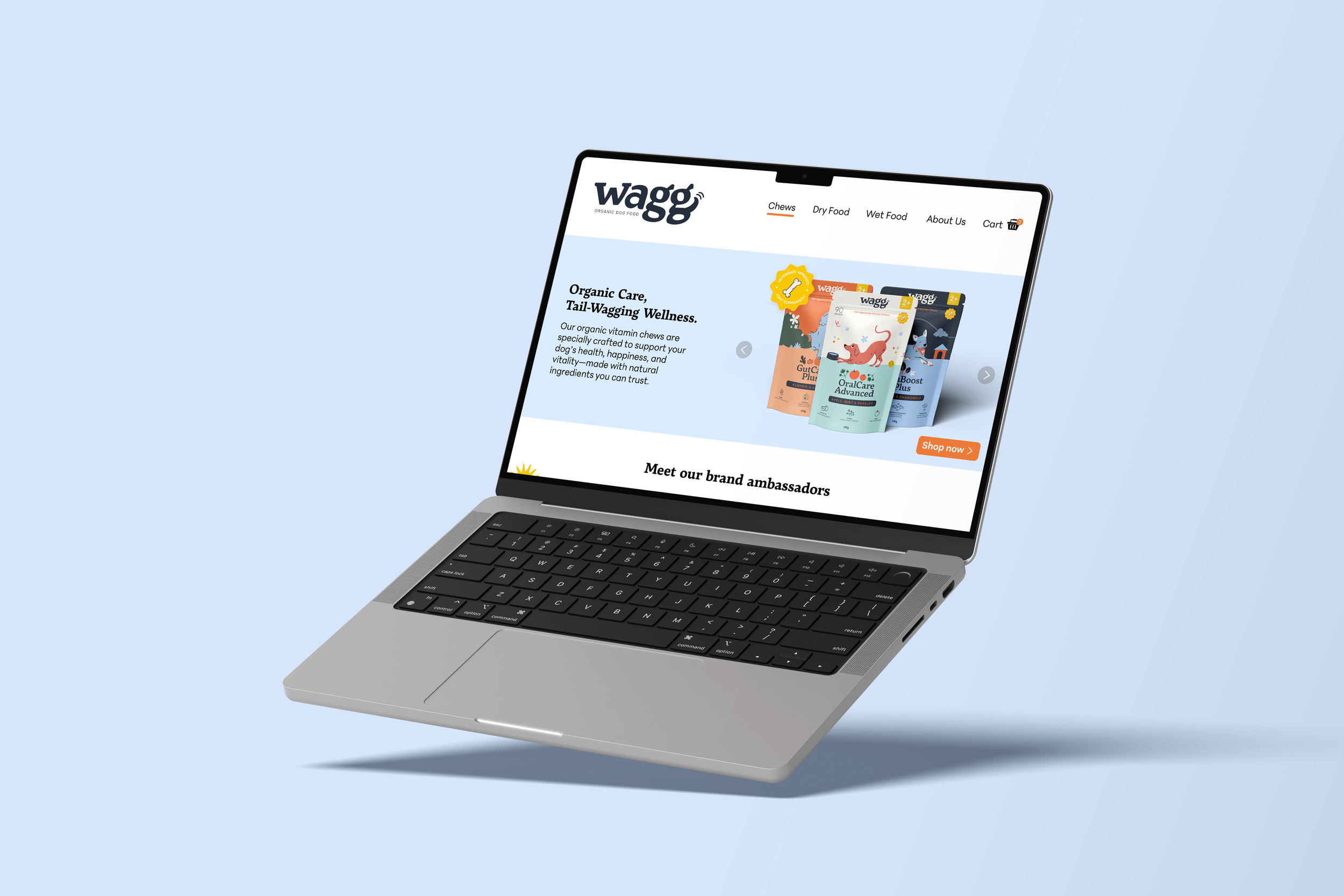 We developed a visual identity that bridges the gap between affordable nutrition and modern, design-forward pet brand. The design language uses bold, lively colour cues, smart typography, and energetic visuals of pets (tails, motion, play), all rooted in Wagg’s brand truth and heritage.