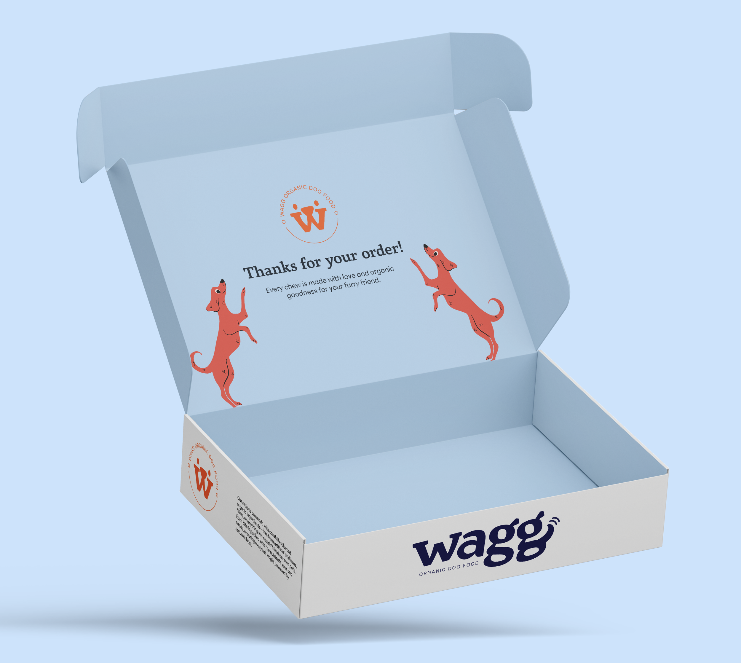 The box packaging extends Wagg’s joyful personality into the unboxing experience. A custom illustrated pattern featuring the brand’s playful pet characters and icons adds life and movement, creating a sense of fun before the box is even opened. Inside, warm, friendly messaging greets the customer. Small moments of delight that reflect Wagg’s caring nature and attention to detail.